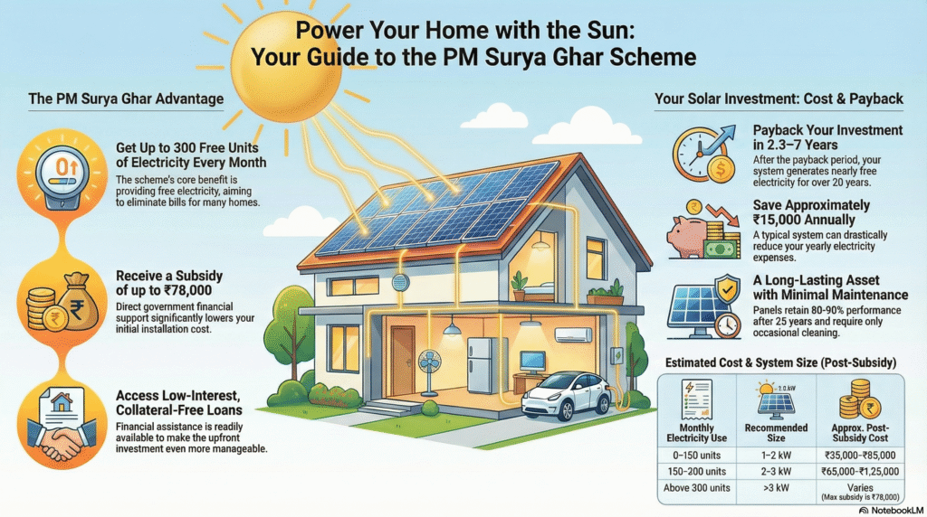 Infographic detailing the benefits, costs, and system sizes of the PM Surya Ghar Scheme for home solar power in India.